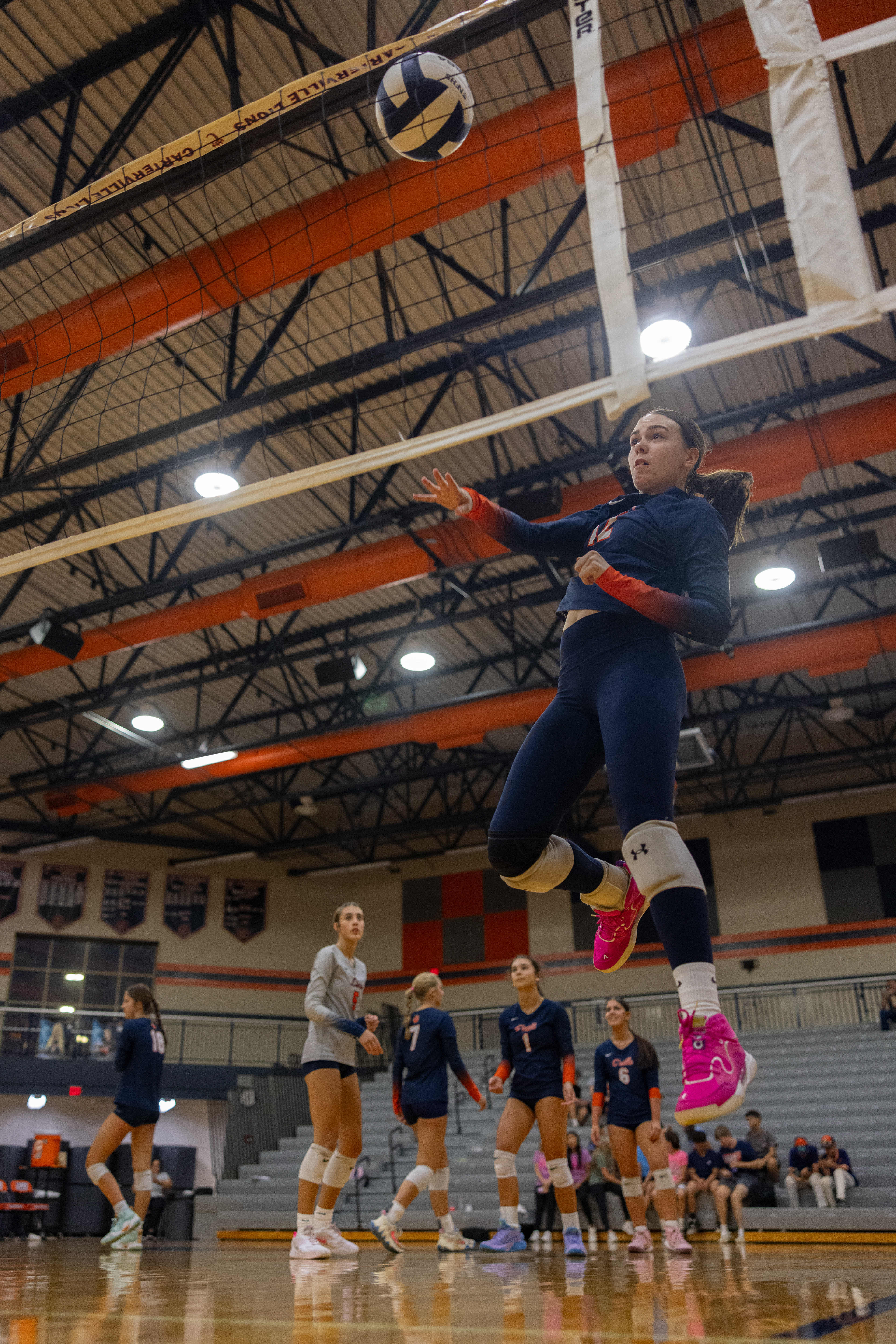 Layla Yates (12) goes for a spike practicing before a match between the Carterville Lions and the Marion Wildcats September 10, 2025 at the athletic center at the Carterville Community High School in Carterville, Illinois.